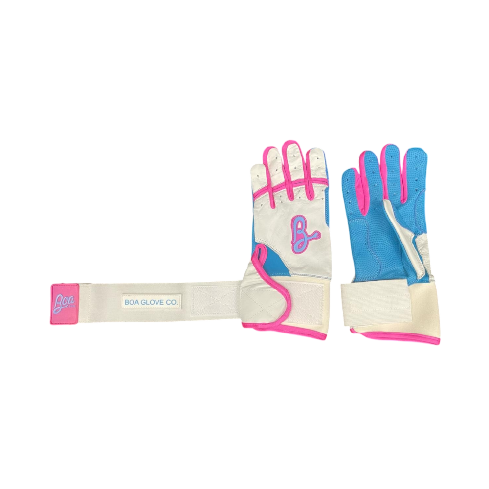 Elevate your game with Boa Custom’s premium cotton candy batting gloves, designed for style, comfort, and performance. Perfect for baseball and softball players, these gloves feature a sleek white base with striking pink or baby blue accents, adding a pop of color to your uniform while keeping you looking fresh on the field.
